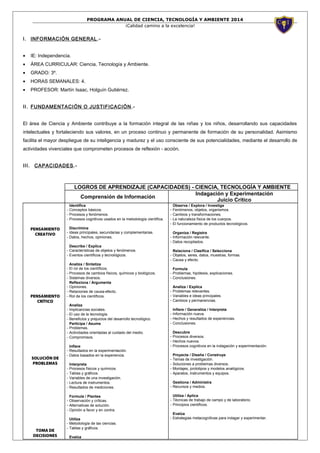 El documento presenta el programa anual de Ciencia, Tecnología y Ambiente para el grado 4to. Incluye información general sobre el área curricular, la justificación, las capacidades y logros de aprendizaje, los valores y temas transversales, la calendarización y organización de las unidades didácticas. El programa busca desarrollar capacidades intelectuales y valores mediante actividades vivenciales que involucran procesos de indagación, experimentación y reflexión-acción.