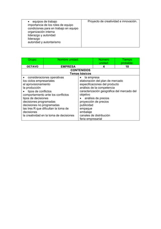 El primer documento presenta los contenidos básicos de la unidad 1 sobre el mercado, la producción, los agentes económicos, el sistema financiero y los planes de negocios. El segundo documento detalla los contenidos de la unidad 2 sobre cómo enfrentar obstáculos, la toma de decisiones, el trabajo en equipo y la ética, así como el entorno y el proyecto de vida. El tercer documento cubre los temas de la unidad 3 incluyendo la localización empresarial, la cultura empresarial y los equipos de trabajo.
