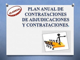El documento define el Plan Anual de Adquisiciones y Contrataciones como el programa detallado de todas las licitaciones, concursos y adjudicaciones directas que se ejecutarán durante un año presupuestal en una entidad. Explica que es importante para prever y organizar eficientemente los recursos de la entidad y evitar un uso erróneo de los fondos públicos. Además, detalla los pasos y criterios para formular correctamente el plan, como realizar estudios de mercado, determinar los procesos de selección, e indicar códigos y