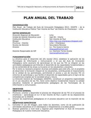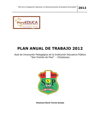 Este documento presenta el Plan Anual de Trabajo 2012 del Aula de Innovación Pedagógica de la Institución Educativa Pública "San Vicente de Paul" en Chaclacayo, Lima. El plan busca promover la integración de las tecnologías de la información y la comunicación en el proceso de enseñanza-aprendizaje a través de actividades como capacitación docente, uso de herramientas digitales y participación en concursos. El documento incluye una fundamentación, objetivos, bases legales, análisis F