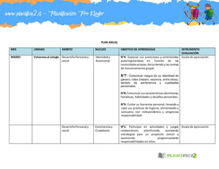 El documento presenta el plan anual de primer semestre de una unidad educativa. Incluye los meses de marzo a julio, las unidades de trabajo, los ámbitos, nucleos y objetivos de aprendizaje e instrumentos de evaluación. El plan abarca las áreas de desarrollo personal y social, comunicación integral, interacción y comprensión del entorno, e incluye unidades como "volvemos al colegio", "el cuerpo y mis emociones" y "llegamos al invierno".