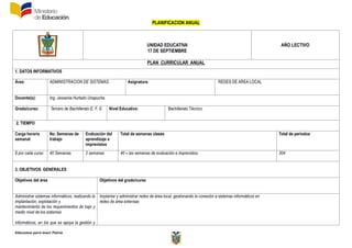 El documento presenta el plan curricular anual para el área de Administración de Sistemas y la asignatura de Redes de Área Local en tercero de bachillerato. Se detallan los objetivos generales y específicos, contenidos, metodologías y evaluación de cinco unidades de planificación sobre conceptos básicos de comunicación de datos, aspectos físicos de transmisión, arquitectura de comunicaciones, introducción a redes de área local e implantación de una RAL. El plan busca que los estudiantes conozcan y apliquen los fundament