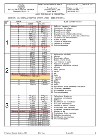 Este documento presenta el plan anual de estudios del área de Tecnología e Informática para grados sexto a noveno de una institución educativa. Incluye los ejes conceptuales que se abordarán en cada periodo así como las fechas. Los temas a tratar incluyen definiciones básicas de hardware y software, uso de herramientas tecnológicas, diseño, mecánica, electricidad, comunicaciones e internet.