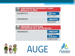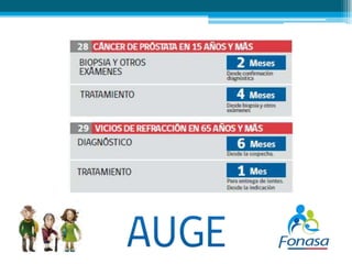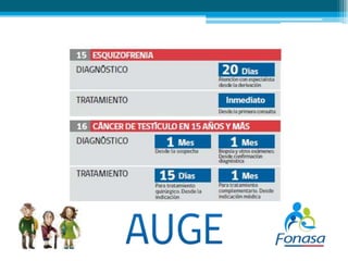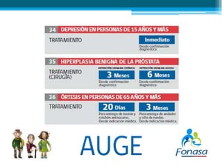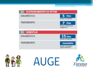 El documento resume el Plan Auge de Chile, un programa de salud que garantiza el acceso a tratamientos para 69 enfermedades. El Plan Auge es un derecho garantizado por ley que establece plazos máximos para el diagnóstico y tratamiento de las enfermedades cubiertas. Las personas se pueden acceder al Plan Auge a través de los consultorios de atención primaria o llamando a los servicios de urgencia en caso de emergencia.
