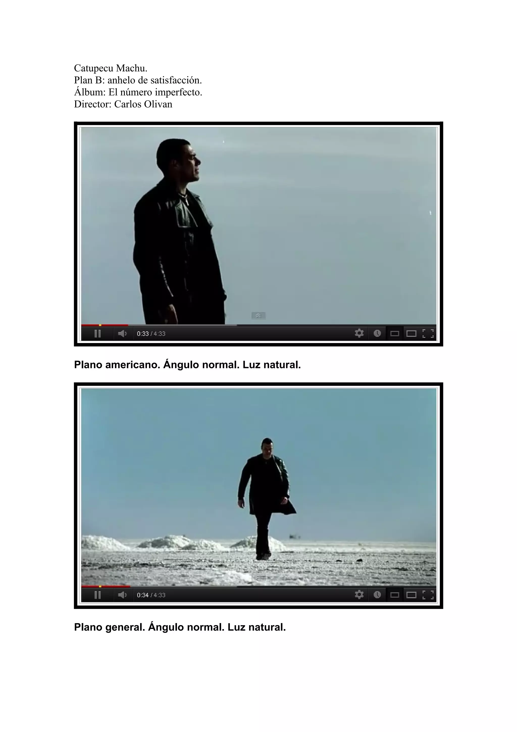 Este documento resume un video musical de la banda argentina Catupecu Machu para su canción "Plan B: Anhelo de satisfacción" del álbum "El número imperfecto". El video fue dirigido por Carlos Olivan y filmado en exteriores en San José de las Sierras, Córdoba. Los planos son principalmente planos generales y de ángulos normales con luz natural, y muestran al cantante solo en un paisaje desierto representando el momento crítico por el que pasaba la banda después de un accidente.