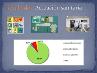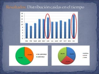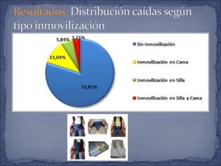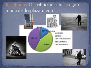 Este documento describe un estudio sobre las caídas en personas mayores institucionalizadas en un centro residencial en Sevilla. Resumiendo: 1) Más de la mitad de los residentes sufrieron al menos una caída en el último año, siendo más frecuentes en mujeres y personas con demencia, artrosis o hipertensión; 2) Los factores asociados a mayor riesgo de caídas incluyen la polimedicación, falta de sistemas de sujeción y caídas previas; 3) La mayoría de caídas no tuvieron consecu