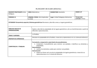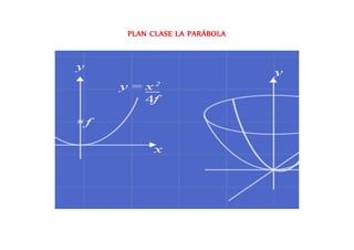 El documento presenta el plan de clase para enseñar sobre la parábola en geometría para el grado 10. La clase se centrará en reconocer las propiedades de la parábola a través de su representación en un sistema de coordenadas. La lección incluye actividades como un crucigrama, visualización de imágenes, definición formal del tema, práctica con el programa Geogebra y evaluación. El objetivo es que los estudiantes comprendan los elementos y propiedades de la parábola como el foco, directriz, radio