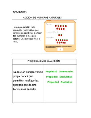 Este documento presenta el plan de clases para la asignatura de Español para el grado 4 durante la semana del 25 al 29 de abril de 2010. El indicador de logro es establecer las diferencias entre operaciones matemáticas y sus propiedades. Los núcleos temáticos son la adición de números naturales, propiedades de la adición, sustracción de números naturales y operaciones combinadas. Las actividades incluyen explicar la adición de números naturales y las propiedades de la adición como la conmutativa, modulativa y asociativa con ejemplos