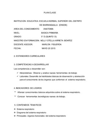 Este plan de clase propone enseñar sobre el sistema respiratorio a estudiantes de quinto grado. Las competencias a desarrollar son interpretativas y laborales relacionadas con la observación y el conocimiento de los órganos respiratorios. Los contenidos incluyen el sistema respiratorio, su diagrama y los principales órganos. Las estrategias didácticas son el trabajo en grupo y la participación en clases. Se utilizarán recursos como computador, fotocopias e Internet, incluyendo la herramienta Bio Digital Human. La evaluación