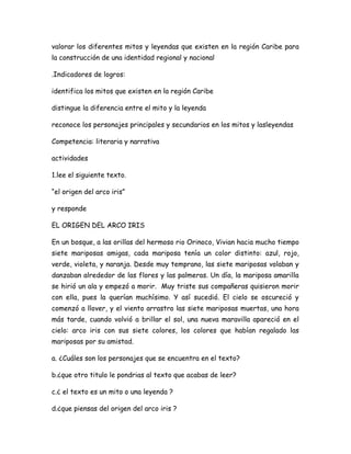 Este documento presenta un plan de clase para una lección sobre mitos y leyendas de la región Caribe de Colombia. El objetivo es que los estudiantes valoren los mitos y leyendas de la región para construir una identidad regional y nacional. La clase incluye la lectura de un texto sobre el origen del arco iris, preguntas sobre el texto, un dibujo de los personajes y una tarea de investigar un mito o leyenda local. También define brevemente qué son los mitos y las leyendas.