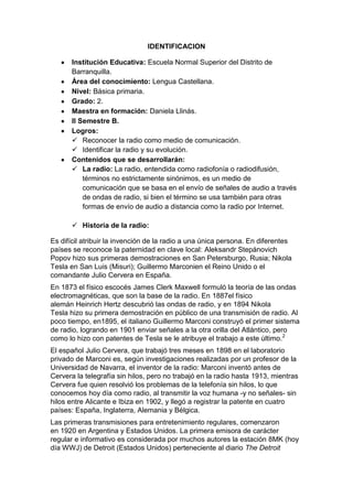 Este documento resume la historia y evolución de la radio como medio de comunicación masivo. Comenzó en la década de 1890 con las primeras transmisiones inalámbricas de audio y ha evolucionado desde entonces gracias a innovaciones tecnológicas como la amplificación de válvulas en los años 1920, la modulación de frecuencia en los años 1930, el transistor en los años 1950 y más recientemente la radio digital y por Internet. La radio sigue siendo un medio importante debido a su bajo costo, portabilidad e inmediatez a pesar de