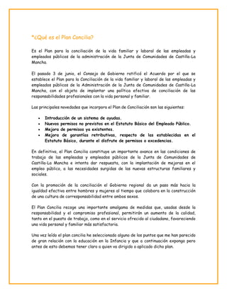 El Plan Concilia es un plan recientemente aprobado por el gobierno de Castilla-La Mancha para mejorar la conciliación de la vida laboral y familiar de los empleados públicos. Introduce un sistema de ayudas, nuevos permisos, mejoras a permisos existentes y mayores garantías retributivas durante permisos. El objetivo es responder a las necesidades de las nuevas estructuras familiares mediante mejoras en el empleo público que favorezcan una mayor calidad de vida tanto laboral como personal.