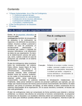 El documento describe las etapas fundamentales para desarrollar un plan de contingencia efectivo, incluyendo: 1) definir el alcance y organización del plan, 2) determinar vulnerabilidades y recursos críticos, 3) seleccionar recursos y planes alternativos, 4) documentar procedimientos detallados, y 5) realizar pruebas y mantenimiento periódicos para garantizar que el plan funcione como se espera. Un plan de contingencia ayuda a las organizaciones a recuperarse rápidamente de incidentes que afecten sus sistemas de información.