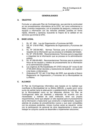 Este documento presenta el Plan de Contingencia Informático de la Municipalidad de La Molina. Describe la situación actual de la Gerencia de Tecnología de la Información y Comunicaciones (GTIC), incluyendo su organización y recursos. Identifica la necesidad de desarrollar un plan de contingencia debido a que carece de una metodología para identificar riesgos y determinar controles. El objetivo es formular un plan que permita la continuidad de los procedimientos informáticos ante fallas o eventos inesperados para asegurar y restaurar equip