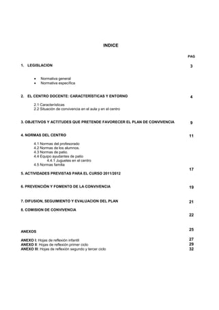 Este documento presenta el plan de convivencia de un centro educativo para el curso 2011-2012. Resume la legislación relevante, describe las características del centro y la comunidad educativa, y analiza la situación actual de la convivencia entre el profesorado, el alumnado y las familias. El clima general de convivencia es bueno aunque se busca mejorar las relaciones entre iguales y reforzar las normas.
