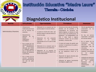 El documento presenta un diagnóstico institucional que identifica fortalezas, oportunidades, amenazas y dificultades en cuanto al uso de las TIC's. Entre las fortalezas se encuentran docentes capacitados y equipos tecnológicos disponibles. Las oportunidades incluyen capacitar a más docentes, conseguir recursos y mejorar la infraestructura. Las dificultades son la falta de capacitación, infraestructura y recursos. Las amenazas son la falta de apoyo gubernamental y seguridad para los equipos.