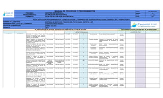 El documento presenta el plan de acción de la Empresa de Servicios Públicos del Patía para el año 2016, con el objetivo de organizar y prestar de forma eficiente los servicios de acueducto, alcantarillado y aseo en la zona urbana. Incluye 19 objetivos estratégicos con sus correspondientes acciones, metas, responsables, recursos y fechas. Los objetivos se enfocan en mejorar la prestación de los servicios, el control de pérdidas de agua, la instalación de micromedidores, actualizar el portafol
