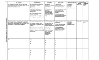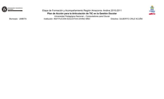 Este documento presenta un plan de acción para articular el uso de las TIC en la gestión escolar de la Institución Educativa Divino Niño en Umbita entre 2010 y 2011. El plan tiene como objetivos orientar a los docentes para que utilicen el correo electrónico y la página web de la Secretaría de Educación, diseñar un plan de capacitación sobre el manejo de TIC para docentes y estudiantes, y subir información a la página web y blogs. Las acciones incluyen talleres, charlas y el intercambio de información por