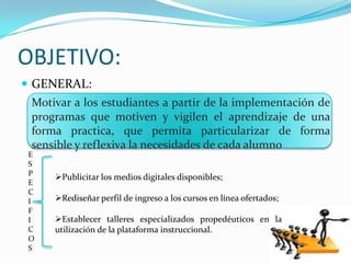El documento presenta un plan de acción institucional para motivar a los estudiantes a través de programas que atiendan sus necesidades individuales. El objetivo general es implementar programas prácticos que fomenten el aprendizaje de forma sensible y reflexiva. Algunas estrategias específicas son publicitar los recursos digitales disponibles, rediseñar el perfil de ingreso a cursos en línea y establecer talleres especializados para el uso de plataformas educativas. El plan incluye indicadores como la afluencia a cursos, insc