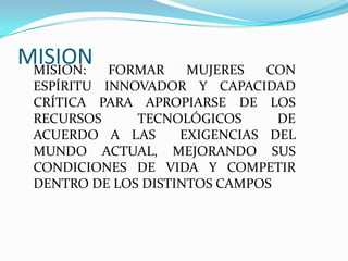 Este documento presenta la misión, visión y objetivos de mejora continua de la Institución Educativa Santa Teresita. Su misión es formar mujeres con espíritu innovador y capacidad crítica para aprovechar los recursos tecnológicos y mejorar sus condiciones de vida. Su visión para 2014 es convertirse en una comunidad líder en el uso de procesos y medios tecnológicos de forma innovadora. Sus propósitos incluyen mejorar la calidad educativa mediante el uso de las TIC y transformar las prácticas ped