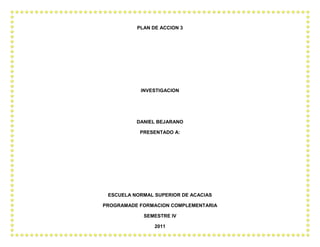 Este documento presenta un plan de acción compuesto por 4 actividades diseñadas para desarrollar las inteligencias múltiples en un grupo de niños. Las actividades incluyen una danza para trabajar la inteligencia corporal, una lectura y narración oral para desarrollar la inteligencia lingüística, una reflexión sobre la autoimagen para fomentar la inteligencia interpersonal e identificar emociones a través de tarjetas para la inteligencia intrapersonal. El documento evalúa el progreso de los niños a través de listas de