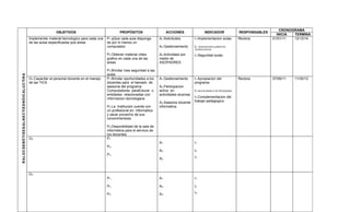 Este documento presenta un plan de acción para implementar el uso de TIC en una escuela. El plan tiene cuatro objetivos principales: 1) Proporcionar un computador para cada aula, obtener materiales audiovisuales y mejorar la seguridad de las aulas. 2) Capacitar al personal docente en el uso de TIC. 3) Mejorar el manejo de programas informáticos y complementar el trabajo pedagógico con TIC. 4) No se especifican otros objetivos. El plan incluye propósitos, acciones, indicadores y responsables para cada objet