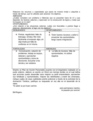 Este documento presenta las actividades de diagnóstico de la fase de emprendimiento para los estudiantes. Incluye análisis de cualidades emprendedoras, realización de DOFA personal y plan de acción, y lectura sobre emprendedores exitosos colombianos para que los estudiantes identifiquen habilidades, actitudes y conocimientos necesarios para emprender un negocio. El objetivo es que los estudiantes descubran su perfil profesional a través del conocimiento y la motivación llevando la teoría a la práctica.