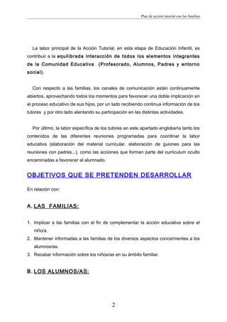 Este documento presenta un plan de acción tutorial con las familias en una escuela infantil. Propone tres objetivos principales: 1) establecer una comunicación fluida entre el centro y las familias a través de reuniones, contacto informal y comunicación escrita; 2) proporcionar información individual sobre cada niño mediante entrevistas personales y horarios de atención; y 3) elaborar informes individuales trimestrales sobre el progreso de cada niño. El plan describe en detalle las diferentes actividades y estrategias para lograr estos objetivos.