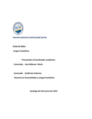 El documento presenta el plan de área de Lengua Castellana para el Centro Docente Bartolomé Mitre. Justifica la importancia de la enseñanza de la lengua castellana y propone como objetivos generales desarrollar la capacidad de comprender y producir textos orales y escritos, así como entender los elementos constitutivos de la lengua. Define metas de calidad por grado y establece estándares, referentes conceptuales, desempeños esperados y estrategias pedagógicas.