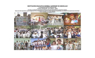 Este documento presenta el plan general de área para el área artística de la Institución Educativa Normal Superior de Sincelejo para el año 2009. Incluye la identificación del área y los docentes, la distribución del tiempo de clase, un diagnóstico de las fortalezas y debilidades del área incluyendo la infraestructura y recursos disponibles, y el marco legal y justificación para la educación artística.