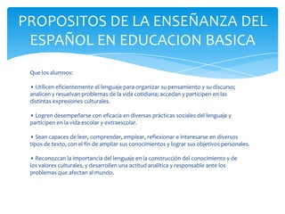 Este documento presenta los propósitos y estándares curriculares de la enseñanza del español en educación básica y secundaria en México. Los propósitos incluyen que los estudiantes utilicen el lenguaje para comunicarse y aprender, analicen información de manera crítica y valoren la diversidad cultural. Los estándares cubren procesos de lectura, producción de textos, habilidades orales y conocimiento lingüístico. El documento también describe las competencias y la organización del currículo por ámbitos como est