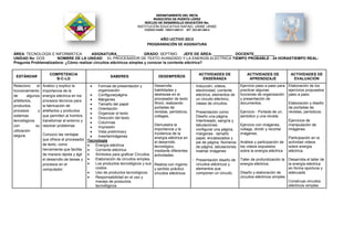 Este documento presenta la programación de una asignatura de Tecnología e Informática para séptimo grado. La programación incluye 4 unidades que abordan temas como el procesador de texto Word, la energía eléctrica, los servicios de Internet y la elaboración de proyectos tecnológicos. Cada unidad presenta competencias, saberes, desempeños, actividades de enseñanza, aprendizaje y evaluación relacionados con los temas.