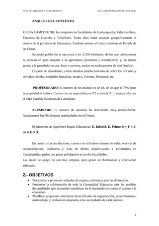 Este documento presenta el Plan de Atención a la Diversidad del CRA Campopetre en Cantalapiedra. Resume los principios, objetivos y criterios para la detección y evaluación de necesidades específicas del alumnado. Además, analiza el contexto del centro y clasifica a los alumnos en grupos como necesidades educativas especiales, retraso madurativo, necesidades de compensación educativa y altas capacidades intelectuales.