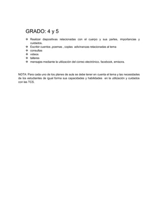 Este documento presenta un plan de estudios para enseñar sobre el cuerpo humano a estudiantes de diferentes grados. El objetivo general es enseñar las partes del cuerpo, su importancia y cuidados de manera dinámica y lúdica utilizando tecnología. Los objetivos específicos incluyen valorar el cuerpo, aprender a usar programas como PowerPoint y aplicar estrategias lúdicas como talleres, canciones y videos. El plan describe actividades para grados 0-1, 2-3, y 4-5 que involucran identificar