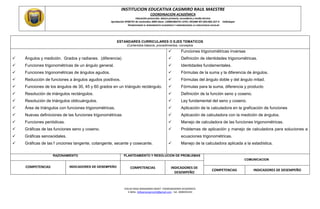 Este documento presenta el plan de aula para el área de matemáticas, asignatura de trigonometría para el grado 10 durante el primer periodo. Incluye los objetivos de aprendizaje relacionados con los sistemas numéricos, geométricos, métricos y de datos, así como los contenidos, actividades y métodos de evaluación para el periodo. El docente aplicará conceptos y herramientas trigonométricas para resolver problemas matemáticos y de otros campos a través de modelación, ejercicios y debates evaluados de forma formativa