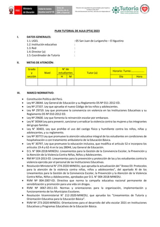 El documento presenta el Plan Tutorial de Aula (PTA) 2023 para una institución educativa. Establece los objetivos y estrategias de la tutoría y orientación educativa para el año escolar, incluyendo actividades formativas, promocionales y preventivas. El PTA busca implementar la tutoría grupal e individual para contribuir a la formación integral de los estudiantes, desarrollar espacios con las familias y comunidad, y fortalecer la participación estudiantil. El plan se basa en el marco normativo de la educación peruana y tiene como objet
