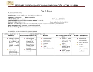 Este documento presenta un plan de bloque para una lección de computación en PowerPoint para estudiantes de 5to grado. El objetivo es que los estudiantes aprendan a utilizar PowerPoint para facilitar la comprensión. La lección se enfocará en cómo identificar y crear diapositivas e insertar imágenes y texto usando la barra de menú de PowerPoint. Se utilizarán presentaciones, videos tutoriales, proyectores y pizarras como recursos y se evaluará si los estudiantes pueden crear cinco diapositivas en blanco con su nombre de escuela