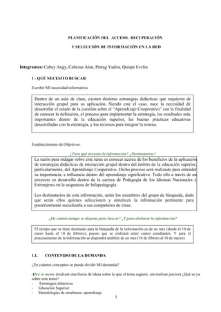 El documento habla sobre la necesidad de desarrollar el estado de la cuestión sobre el aprendizaje cooperativo con el fin de conocer su definición, el proceso de implementación, los resultados en educación superior, las buenas prácticas y los recursos para integrarla. Se establece un plan para buscar, compilar, contrastar y organizar información sobre aprendizaje cooperativo en educación superior en bases de datos y Google Académico durante un mes.