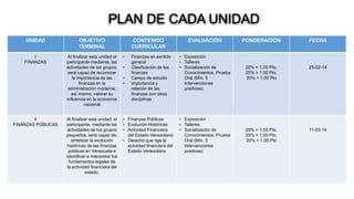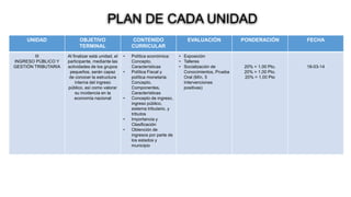 El documento presenta un plan de estudios dividido en 8 unidades. Cada unidad contiene un objetivo terminal, los contenidos curriculares, la forma de evaluación y la fecha. Los temas a cubrir incluyen finanzas públicas y privadas, impuestos, gasto público y fuentes de financiamiento. La evaluación consta de exposiciones, talleres, debates y una prueba oral.