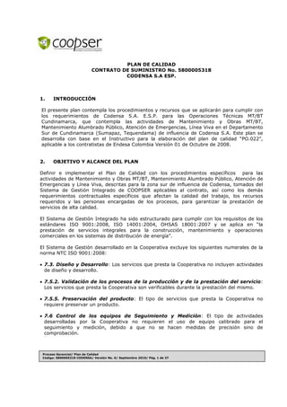 Este documento presenta el Plan de Calidad para el contrato de suministro No. 5800005318 entre CODENSA S.A. E.S.P. y COOPSER para la prestación de servicios de mantenimiento y obras en redes MT/BT, mantenimiento de alumbrado público, atención de emergencias y línea viva en la zona sur de Cundinamarca. El plan describe los procesos, procedimientos, normativa y recursos aplicables para garantizar la calidad en la prestación de los servicios de acuerdo con los requisitos contractuales.
