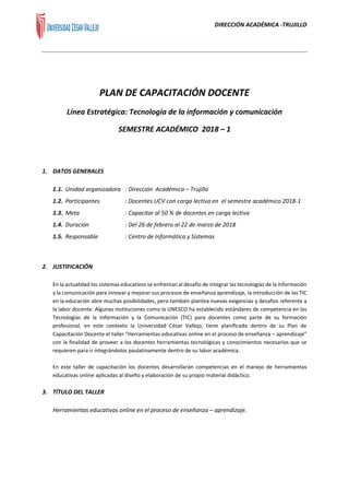 Este documento presenta el Plan de Capacitación Docente de la Universidad César Vallejo para el semestre 2018-1, con el objetivo de capacitar al 50% de los docentes en herramientas educativas online. El taller de 12 horas se llevará a cabo del 26 de febrero al 23 de marzo y cubrirá temas como organizadores visuales, presentaciones con Prezi y publicación en la nube. Los docentes desarrollarán competencias en el uso de estas herramientas para el diseño de material didáctico. Se otorgará un certificado a