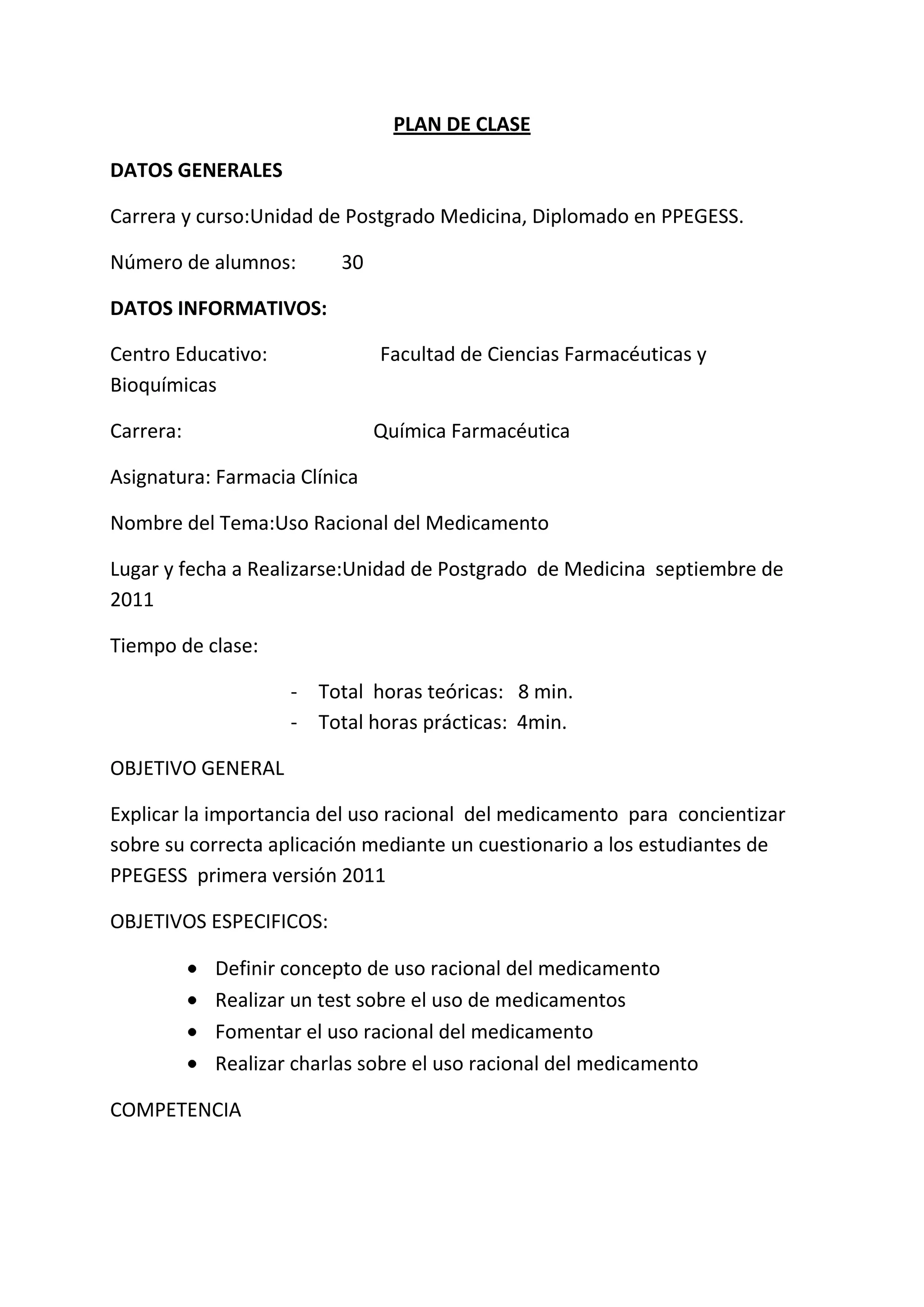 Este documento presenta un plan de clase para una asignatura sobre el uso racional del medicamento en la Facultad de Ciencias Farmacéuticas y Bioquímicas. El plan detalla la carrera, el número de estudiantes, el lugar y fecha de la clase, y los objetivos generales y específicos de la clase, que incluyen definir el concepto de uso racional del medicamento, realizar un test y charlas sobre el tema, y fomentar el uso racional del medicamento entre los estudiantes.