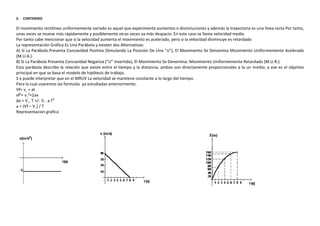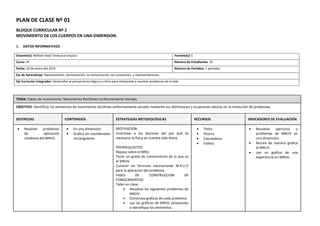 Este plan de clase trata sobre el movimiento rectilíneo uniformemente variado (MRUV) en una dimensión. El objetivo es identificar los elementos del MRUV mediante definiciones, ecuaciones y representaciones gráficas para resolver problemas de la vida cotidiana. Se presentan las fórmulas del MRUV y un ejemplo numérico para practicar su aplicación. Adicionalmente, se proponen actividades complementarias de investigación y observación de videos sobre el tema.