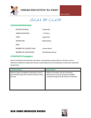 El plan de clase trata sobre la enseñanza del cubo de la suma y diferencia de binomios a estudiantes de quinto de secundaria. El objetivo es que los estudiantes conceptualicen y desarrollen estas operaciones a través de explicaciones directas y resolución de ejercicios. La clase incluye actividades iniciales, de desarrollo y cierre utilizando recursos como imágenes, registros y libros de consulta.