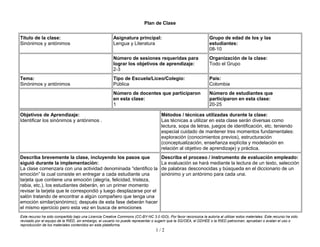La clase trata sobre sinónimos y antónimos para estudiantes de 8-10 años. Consiste en 2-3 sesiones con 20-25 estudiantes y utiliza diversas técnicas como lectura y juegos. La clase comienza con una actividad donde los estudiantes identifican emociones similares y opuestas y luego el maestro explica los conceptos de sinónimo y antónimo. La evaluación implica que los estudiantes busquen sinónimos y antónimos de palabras desconocidas en un texto.