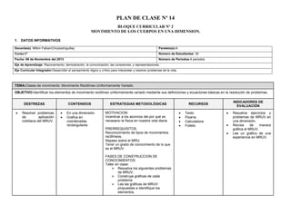 Este documento presenta un plan de clase sobre el movimiento rectilíneo uniformemente variado. El objetivo es identificar los elementos de este tipo de movimiento mediante definiciones, ecuaciones y representaciones gráficas. Se explican conceptos como velocidad variable, aceleración y retardación. También incluye ejemplos, actividades y una evaluación para practicar resolviendo problemas sobre distancia, tiempo y velocidad en este tipo de movimiento.
