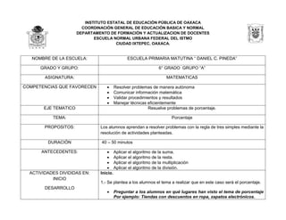 Este documento presenta una lección sobre porcentajes para un grupo de 6° grado. La lección tiene una duración de 40-50 minutos y utiliza ejemplos y actividades prácticas como juegos de equipo para enseñar a los estudiantes a calcular porcentajes usando la regla de tres simple. Los estudiantes aprenderán a resolver problemas de porcentaje de manera individual y grupal aplicando las cuatro operaciones básicas.