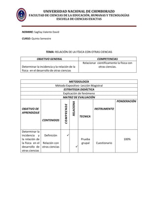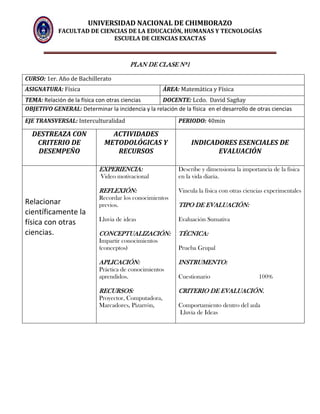 Este documento presenta un plan de clase sobre la relación entre la física y otras ciencias. El objetivo general es determinar la incidencia y relación de la física en el desarrollo de otras ciencias. Se utilizará el método expositivo y estrategias didácticas como explicación de fenómenos. Se evaluará a los estudiantes a través de una prueba grupal con cuestionario que representa el 100% de la calificación. El contenido explica las relaciones entre la física y ciencias como química, biología, astronom
