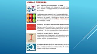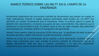 Este documento presenta un marco teórico sobre el uso de las nuevas tecnologías en la enseñanza del español. Explica que las nuevas herramientas como internet y los ordenadores han cambiado el papel del profesor y del alumno. También describe varios recursos didácticos multimedia del Instituto Cervantes como Aveteca, una plataforma con actividades organizadas por nivel. Finalmente, propone planes de clase utilizando estos recursos para trabajar temas gramaticales, culturales y de concienciación social.
