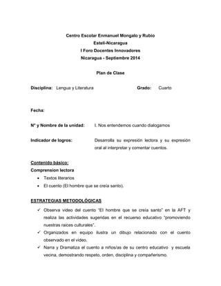 Este documento presenta el plan de una clase de Lengua y Literatura para cuarto grado. La unidad se centra en desarrollar la expresión lectora y oral de los estudiantes a través de la interpretación y comentario de cuentos. Las estrategias metodológicas incluyen ver un video sobre el cuento "El hombre que se creía santo", ilustrar y dramatizar el cuento, elaborar e ilustrar otro cuento, y presentar los trabajos finales ante la clase.